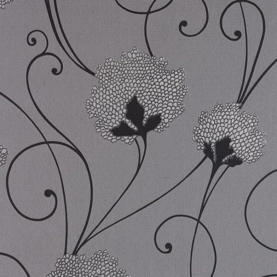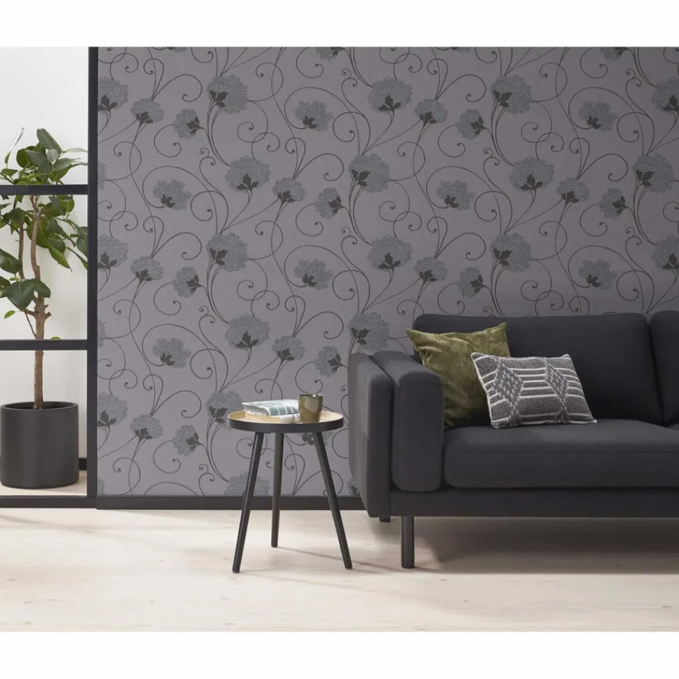 Vliesbehang grijs met sierlijk bloemdessin. Normaal afwasbaar. Voorzien van het FSC-keurmerk. Plakken met Perfax Roll-On. 10 meter per rol.