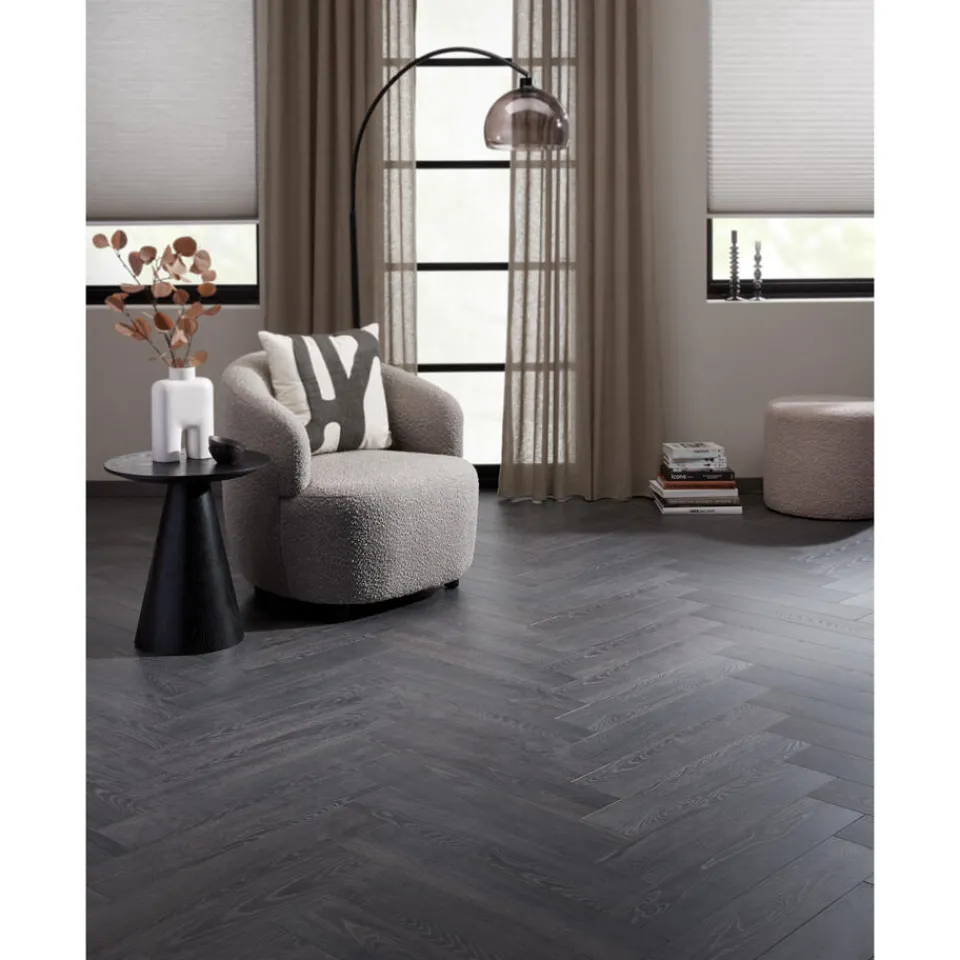 Bijzettafel met zwarte houtlook, rond blad en kegelvormige poot. 45x45x50 cm (lxbxh).