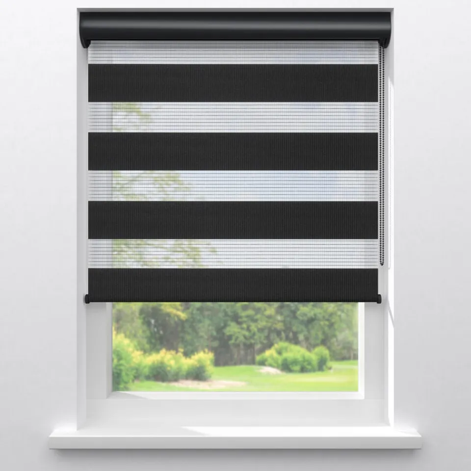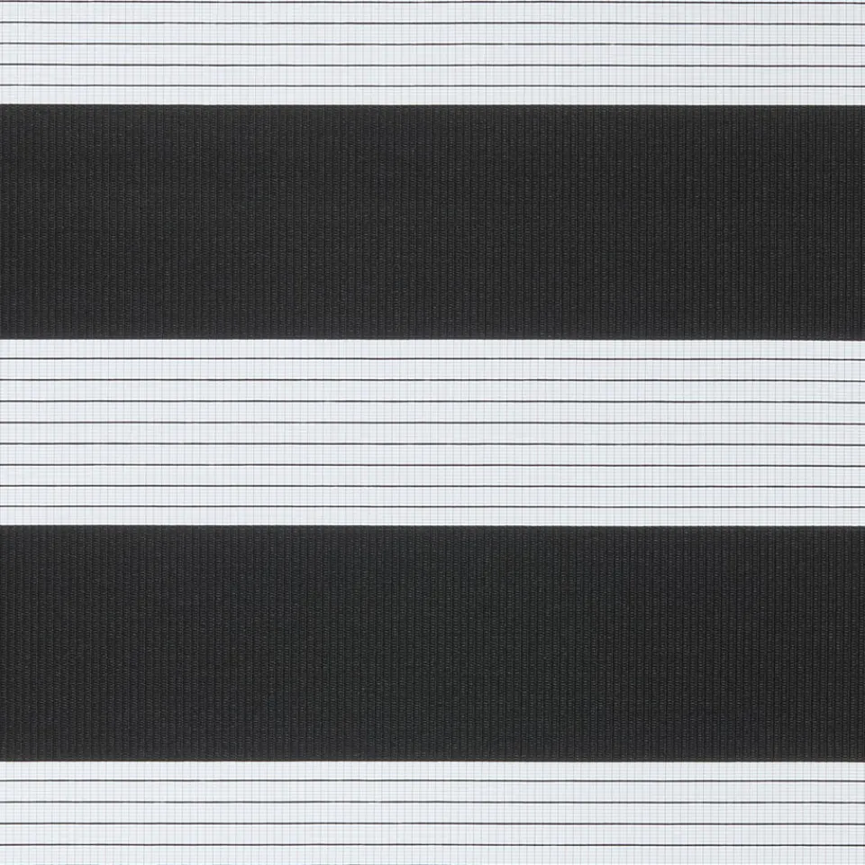 Duo rolgordijn Dean zwart is licht doorlatend. De stof is opgebouwd uit transparante en ondoorzichtige stroken die elkaar afwisselen. Zo kun je met een handig ketting systeem zelf lichtinval en privacy bepalen. Dankzij de eigenschappen van polyester is het duo rolgordijn erg slijtvast en makkelijk schoon te maken met een vochtige doek.