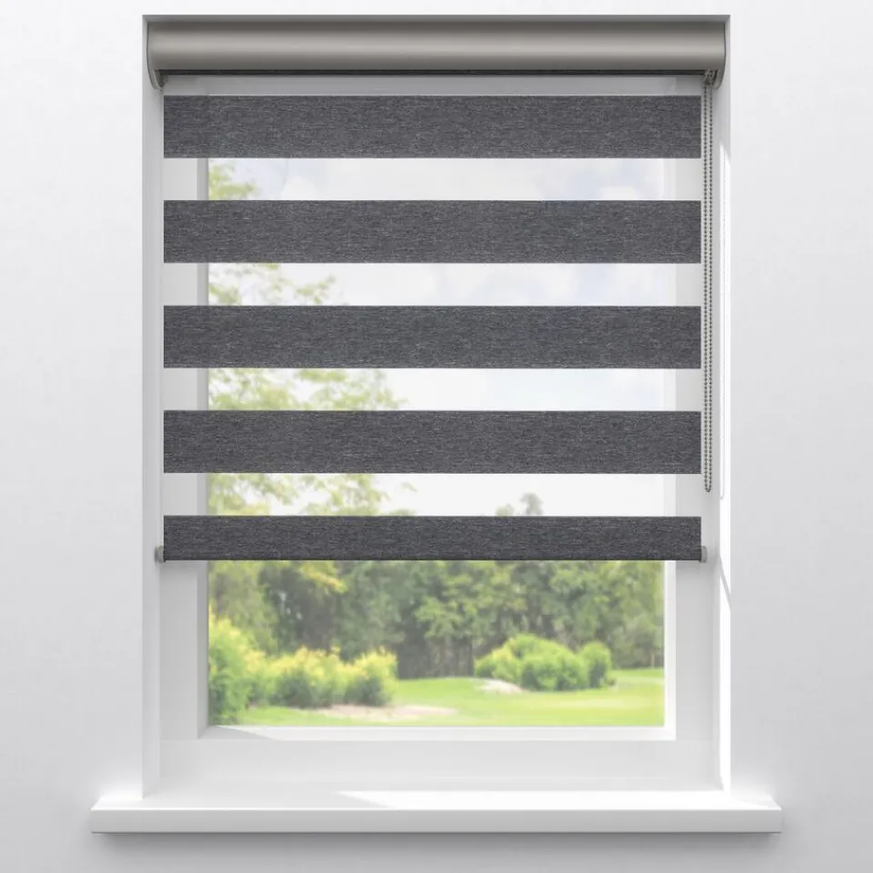 Lichtdoorlatend duo-rolgordijn donkergrijs gemêleerd. De transparante banen hebben een fijne gaasstructuur. De afwisselende open en dichte stofbanen bewegen voor elkaar langs. Zo bepaal je eenvoudig de lichtinval en privacy. Je kunt zelf de kleur kiezen van de cassettes, eindkappen, kettingen, onderlatten en roedes. De bedieningszijde kies je ook zelf: rechts of links. Op maat te maken en eenvoudig met de juiste afmetingen te bestellen.