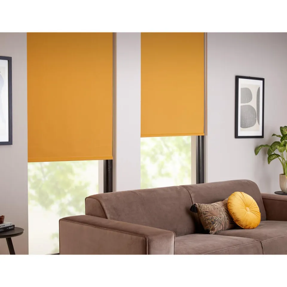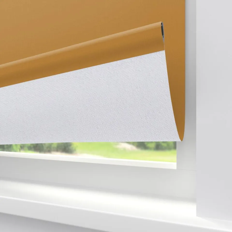 Verduisterend rolgordijn okerkleurig. De witte achterzijde zorgt voor volledige verduistering. Ideaal voor slaapkamers maar ook te gebruiken voor keukens en andere woonruimtes. De stof kan tot 350 cm extra breed worden gemaakt en is geschikt voor grote ramen. Op maat te maken en volledig naar wens samen te stellen met een ruime keuze uit accessoires en uitvoeringen. Elektrische bediening en zijgeleiding is mogelijk. Ook geschikt voor draaikiepramen. Eenvoudig met een vochtige doek af te nemen.