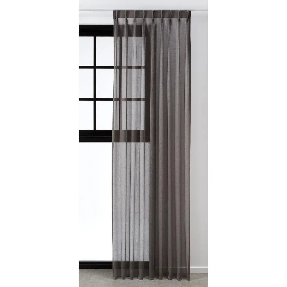 Transparante gordijnstof antracietkleurig. De lichtglanze stof heeft een subtiel opengewerkte structuur en een luxe uitstraling. Stevig, vormvast en soepel. Goed te combineren met een waveplooi maakwijze. 300 cm.
