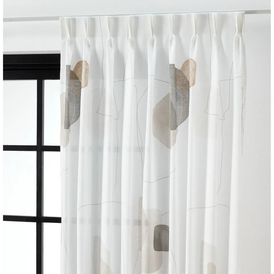 Transparante gordijnstof naturelkleurig met gedrukt abstract patroon. Stevig, vormvast en soepel. 300 cm.