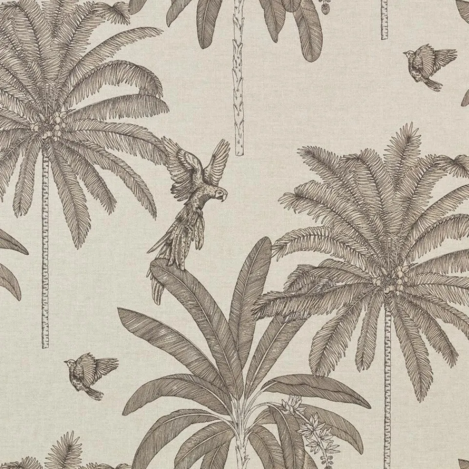 Zandkleurig tafelzeil met tropisch dessin van vogels en palmbomen. 140 cm breed.