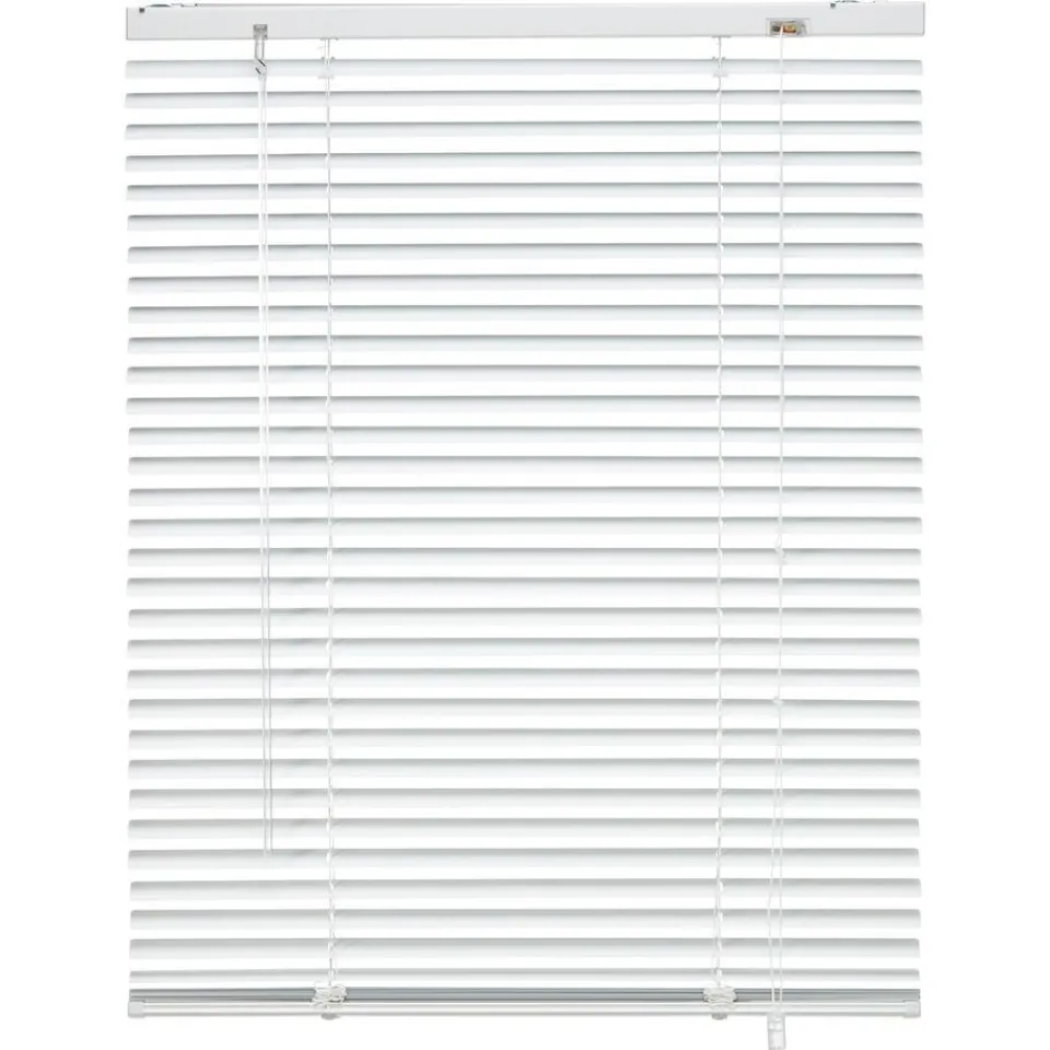 Jaloezie met witte aluminium stroken van 25 mm. Ideaal voor het regelen van licht en privacy. Eenvoudig zelf te monteren. Met vochtige doek reinigen. Het bedieningskoord zit aan de rechterkant, de tuimelstaaf aan de linkerkant. Inhoud verpakking: schroeven, pluggen, montagesteunen, kindveiligheidsclip, montagehandleiding en inkortinstructie.