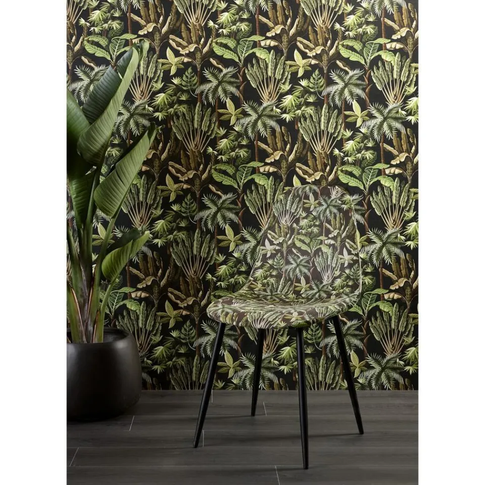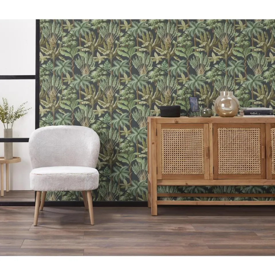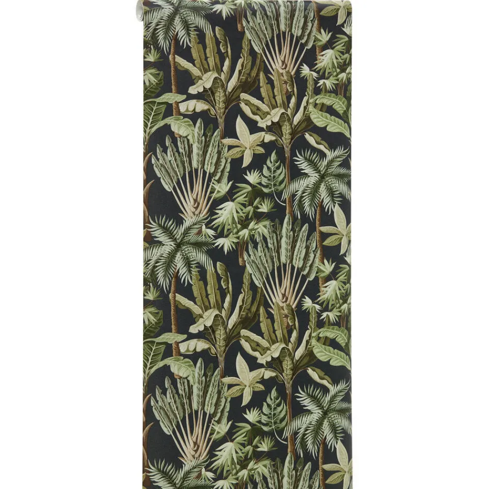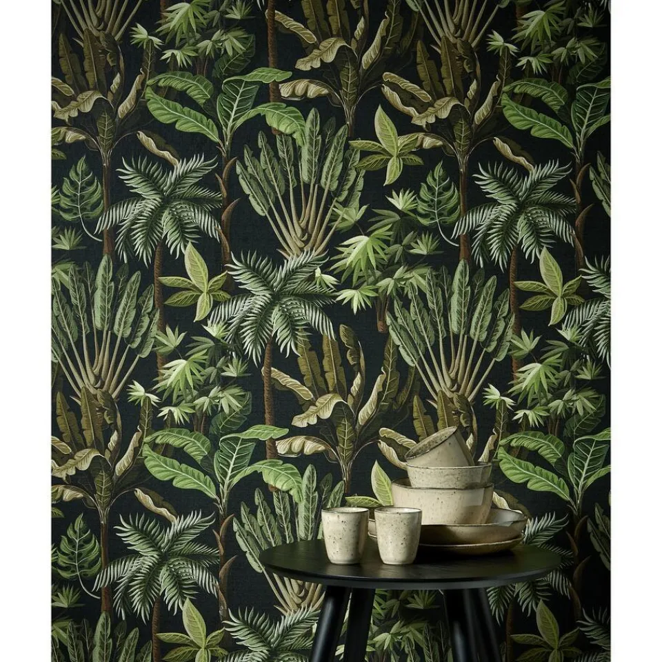 Sfeervol vliesbehang met een botanisch dessin van tropische planten. Licht afwasbaar. 10 meter per rol.