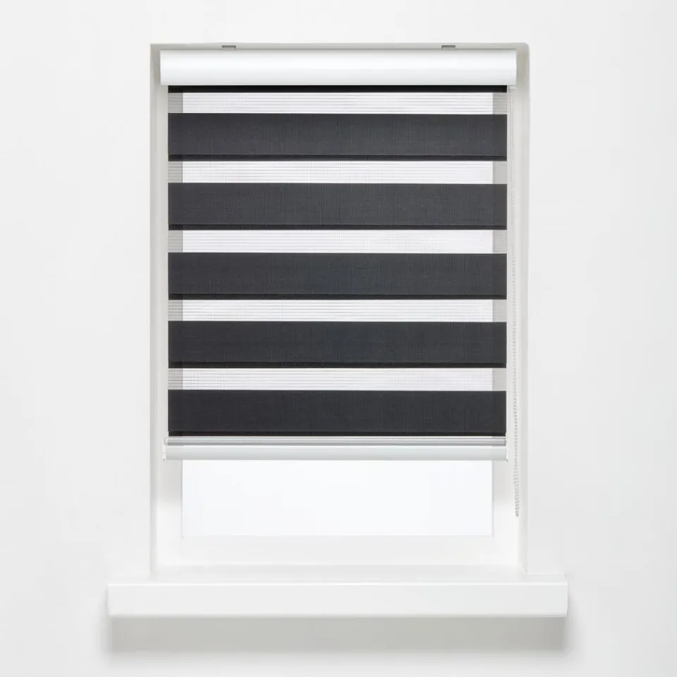 Duo rolgordijn antraciet met elegante bovenkoof. Creëer je eigen lichtinval en privacy. Met afwisselende open en dichte stofbanen en halfronde aluminium bovenkoof.Eenvoudig zelf te monteren. Met vochtige doek te reinigen. Incl. schroeven, pluggen, montagesteunen, kindveiligheidsclip en handleiding.