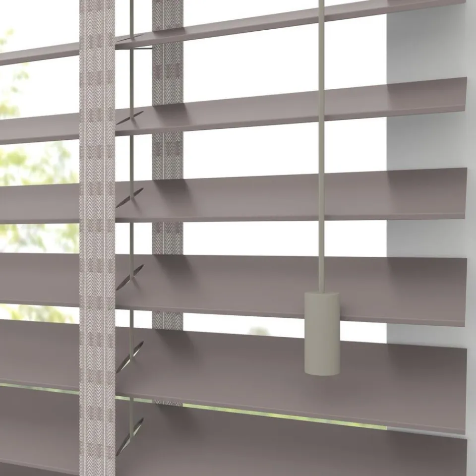 Houten jaloezie taupekleurig. 100% hout. De brede lamellen van 50 mm zorgen voor veel lichtinval en bieden veel privacy wanneer je deze sluit. Op maat te maken en volledig naar wens samen te stellen. Bepaal zelf de bedieningszijde en kies uit diverse accessoires en uitvoeringen. Keuze uit een bijpassend ladderkoord, 48 verschillende ladderbanden en een koordhanger van hout, rvs of zwart metaal.