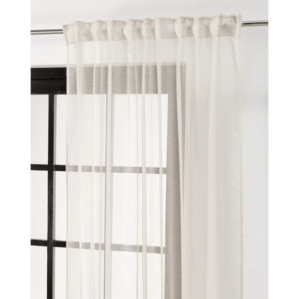Kant en klaar ringgordijn van stevige zandkleurige stof. Soepelvallend en kreukherstellend. 140 cm breed.